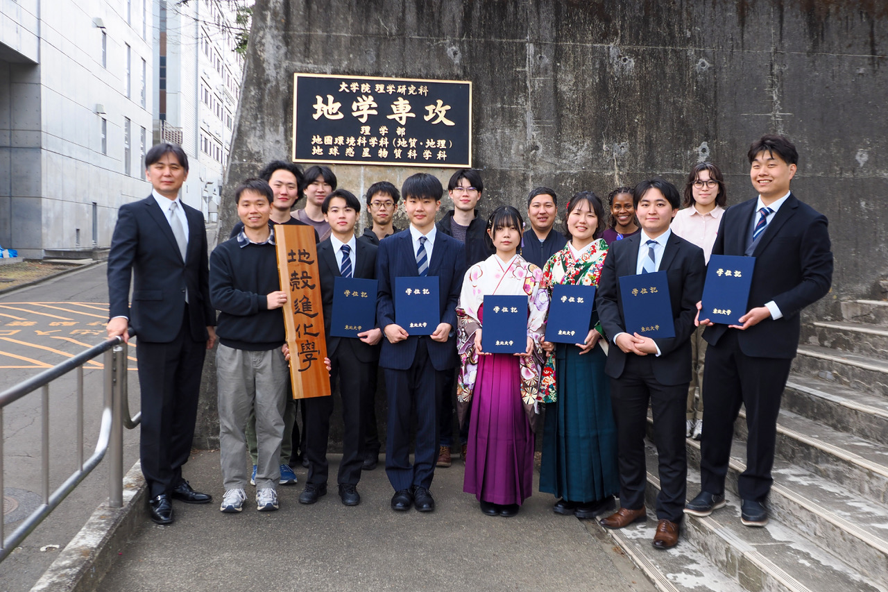 2026年3月25日、暖かい春の陽ざしのもとで2025年度の東北大学の学位授与式が行われました。本研究室からは学部生3名(河野・瀧野・帆足)、修士生3名(梅宮・杉浦・相馬)の学生がそれぞれ学士、修士としての学位が授与されました。去年の4月より地圏環境科学科に研究室の所属が異動となり、慌ただしい中でスタートしたKREATE (KR8)も紆余曲折・様々な障害を乗り越えながら無事1年目を完走いたしました。振り返ってみれば研究テーマは異なるものの、メンバー全員が自分の研究に対して真摯に向き合い、研究室内だけでなく外部の方々とも議論を活発に行っていたと思っています。